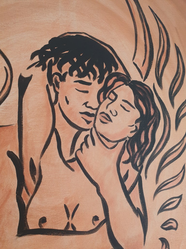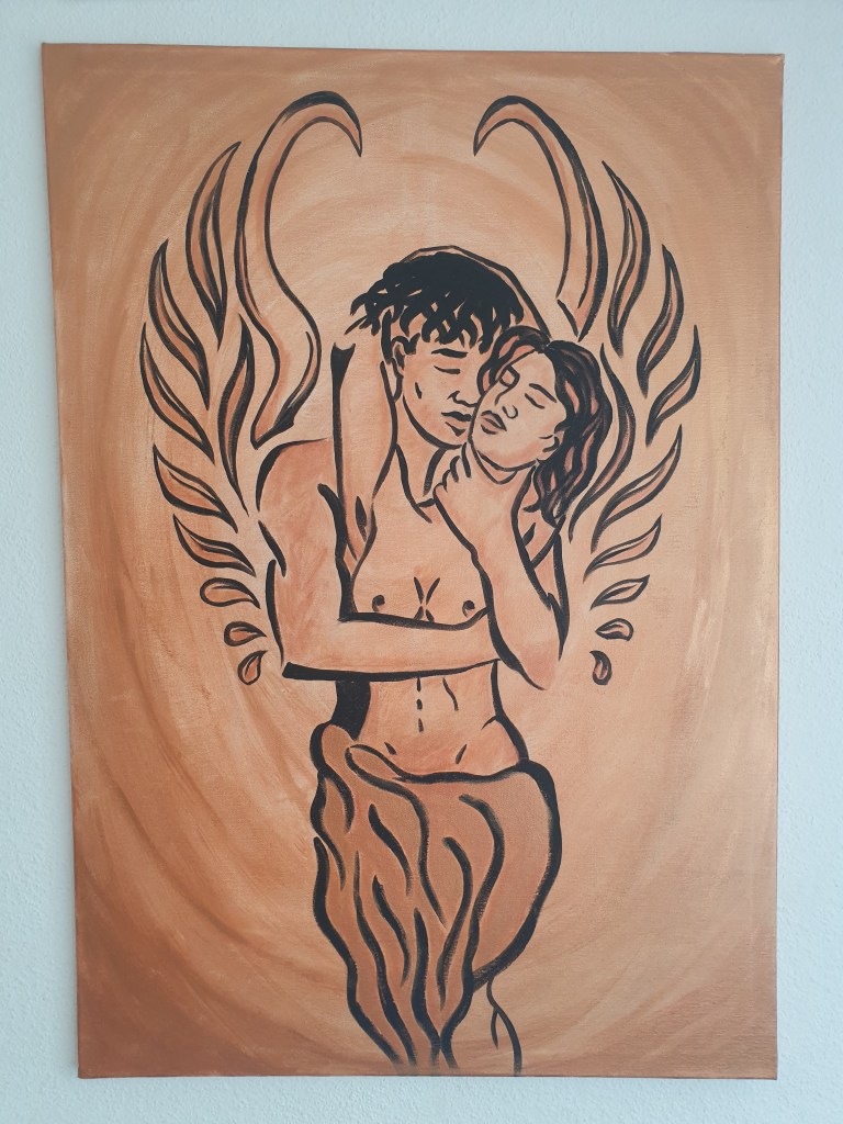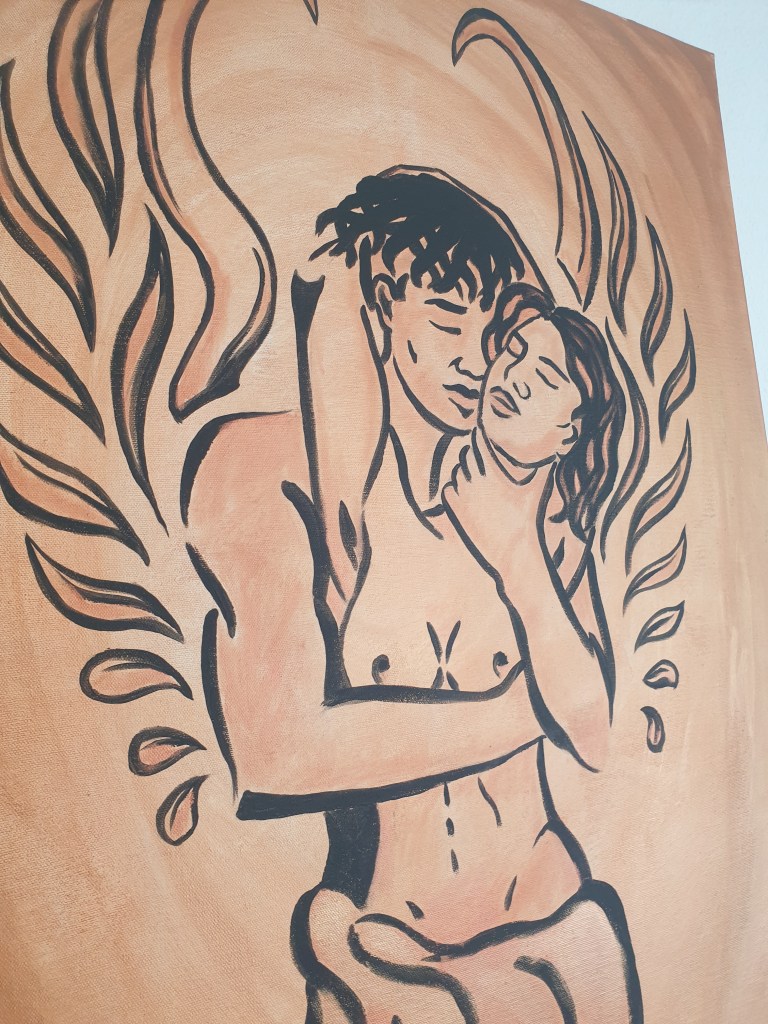 Viktoria ist eine leidenschaftliche Tänzerin und liebt Poledance, Seidentuch, Hoop und alle Arten von Luftakrobatik und Tanz. In diesem Gemälde wird die Luftakrobatik mit dem Seidentuch und der Stange vereint. Während sich das Seidentuch um den Körper schlingt, schlingt sich beim Pole dance der Körper um die Stange. Lässt an den Körper weg, bleibt das Motiv von dem Gemälde übrig.