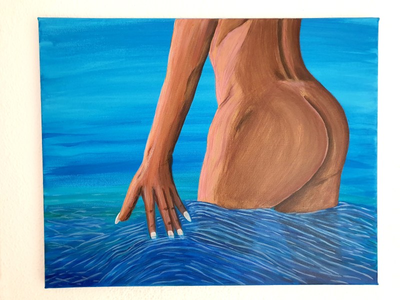 Acrylgemälde eines geschlechtsneutralen Schwimmers in den 4 Elementen: Wasser, Luft, Feuer (Sonne) und Erde. Mit Korallensand.