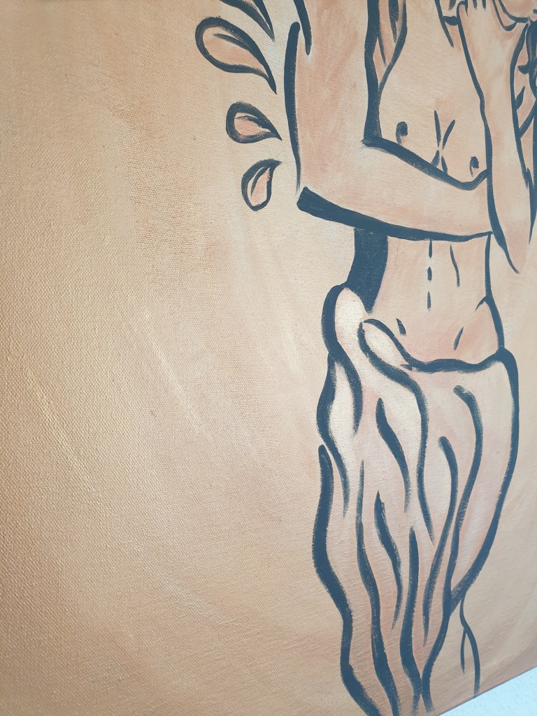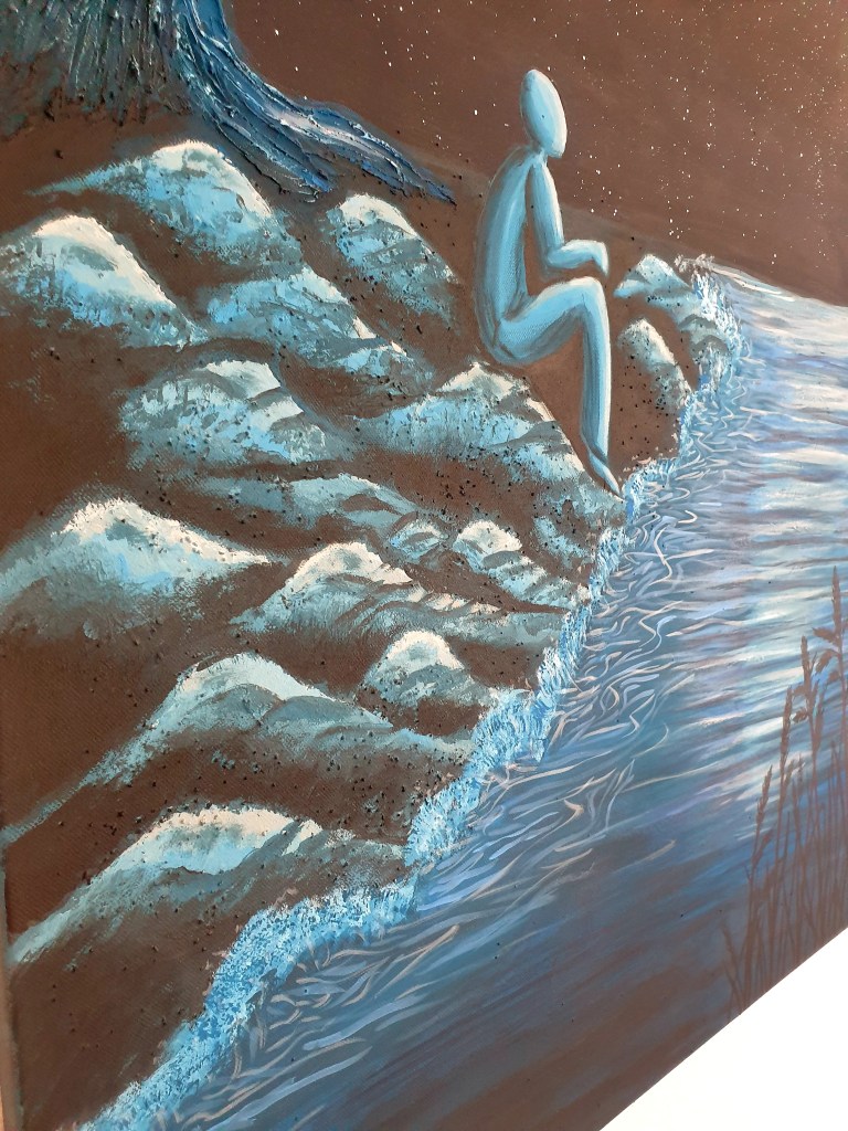 It was my bravest and same time my sadest painting. But it was a calm peaceful sadness and it turned out as a very powerful and creative source. I just had a break up from a relation and I took my largest canvas, where I actually wanted paint a hugging couple on. I took my brush and just started to paint from my feeling. Some shapes of water, rocks, a lonely man looking to the moon. As I started to paint some details of the moon, all the painting became full with energetic calm vibes. The sadness was gone and I painted the shining on the man, on the water and the tree behind him. It was the beginning of a great painting full with positive vibes. Alone, but not lonely.